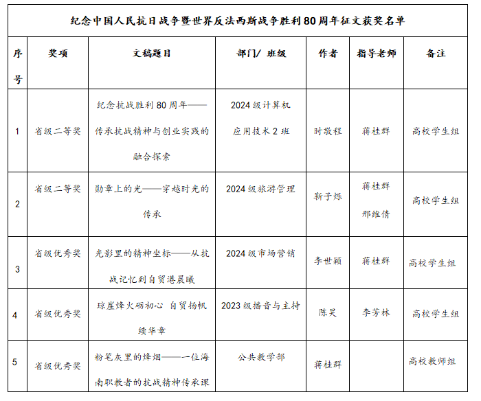 此次获奖成果丰硕,师生作品紧扣抗战精神传承与自贸港时代使命,充分彰显我校爱国主义教育成效,获奖详情如下表所示:
